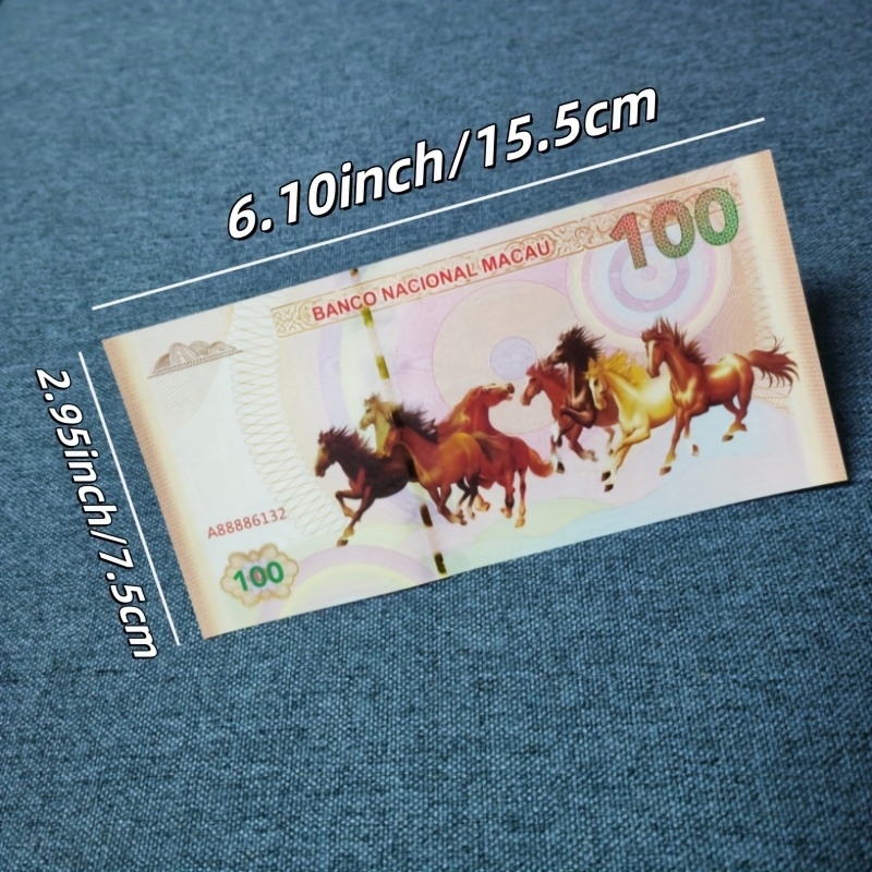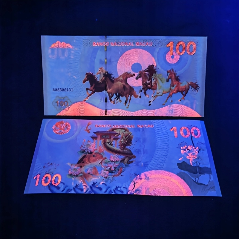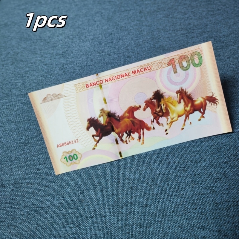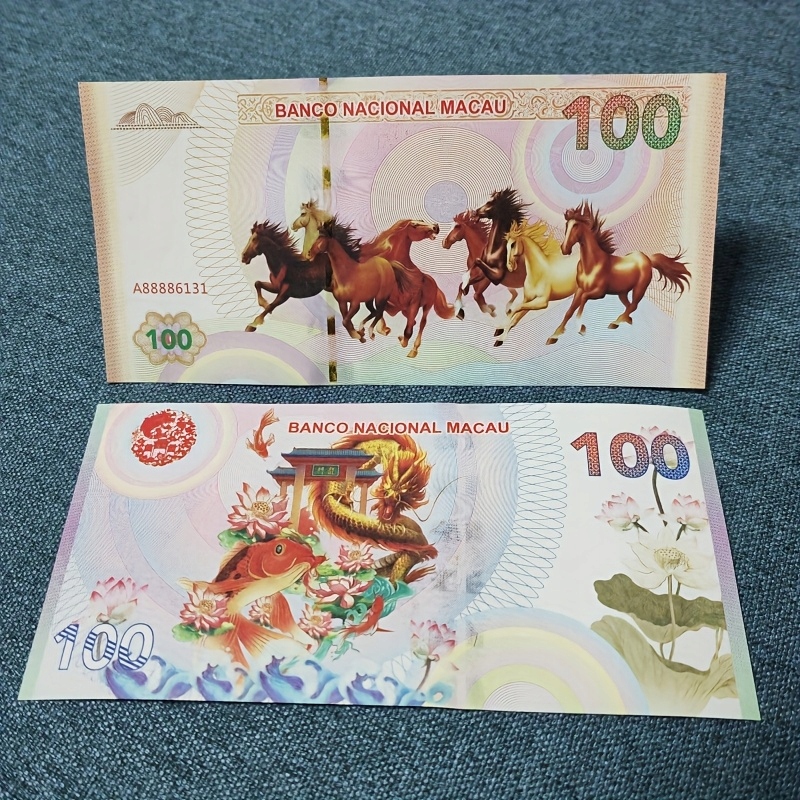 Awers (strona przednia): Na awersie banknotu widnieje dynamiczna scena przedstawiająca kilka galopujących koni. W górnej części umieszczono nazwę banku emitującego: „BANCO NACIONAL MACAU” (Narodowy Bank Macau). W lewym górnym rogu oraz po prawej stronie znajduje się nominał „100”. Dodatkowo, w lewym dolnym rogu powtórzony jest nominał oraz numer seryjny banknotu Całość utrzymana jest w jasnej kolorystyce z subtelnymi, ozdobnymi elementami graficznymi.