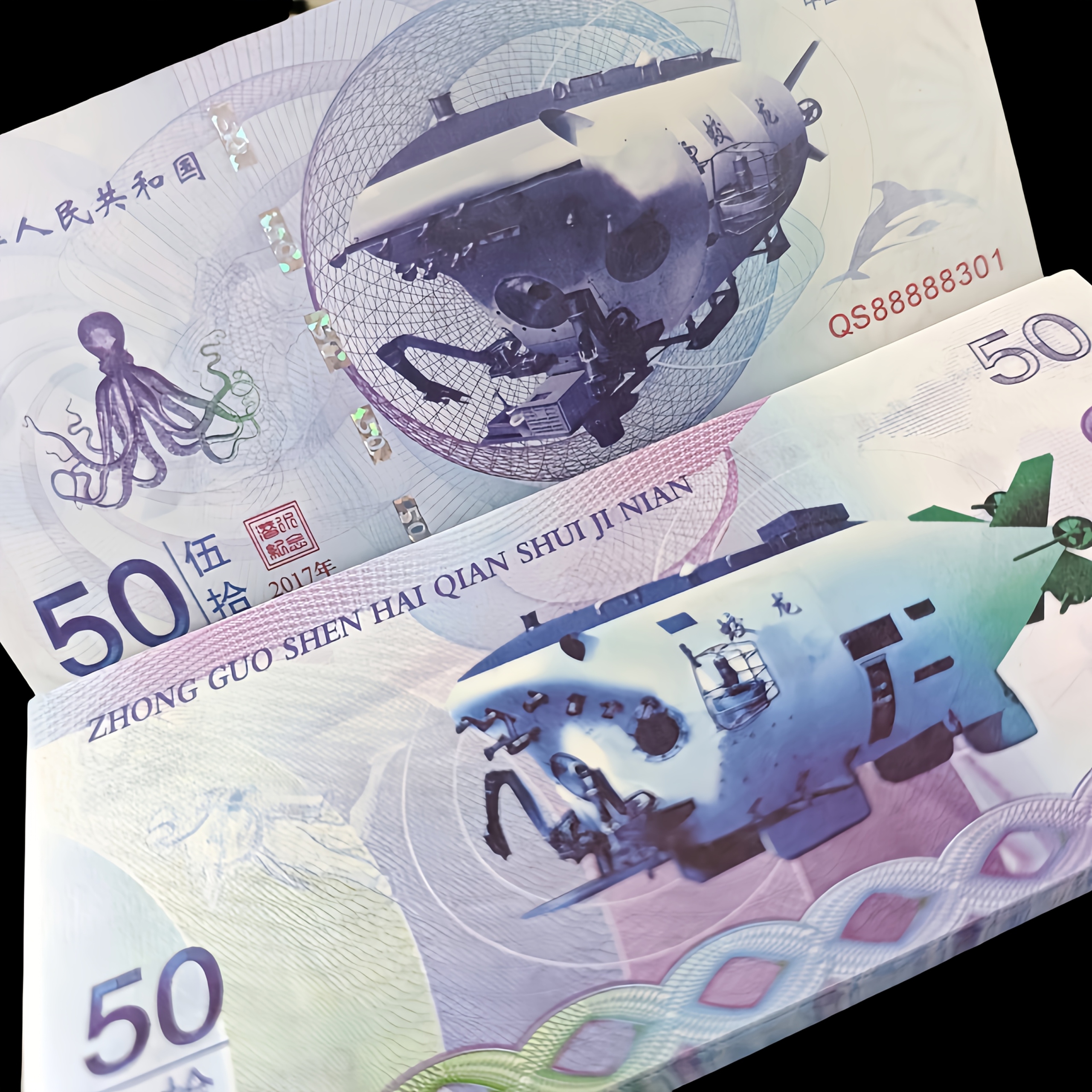 - Motyw główny: Na awersie i rewersie banknotu przedstawiony jest wizerunek chińskiego, załogowego batyskafu głębinowego Jiaolong (蛟龙), który pobił rekordy głębokości w eksploracji rowu mariańskiego. Banknot w piękny sposób łączy technologię z symboliką morskiej fauny (ośmiornica, delfiny).