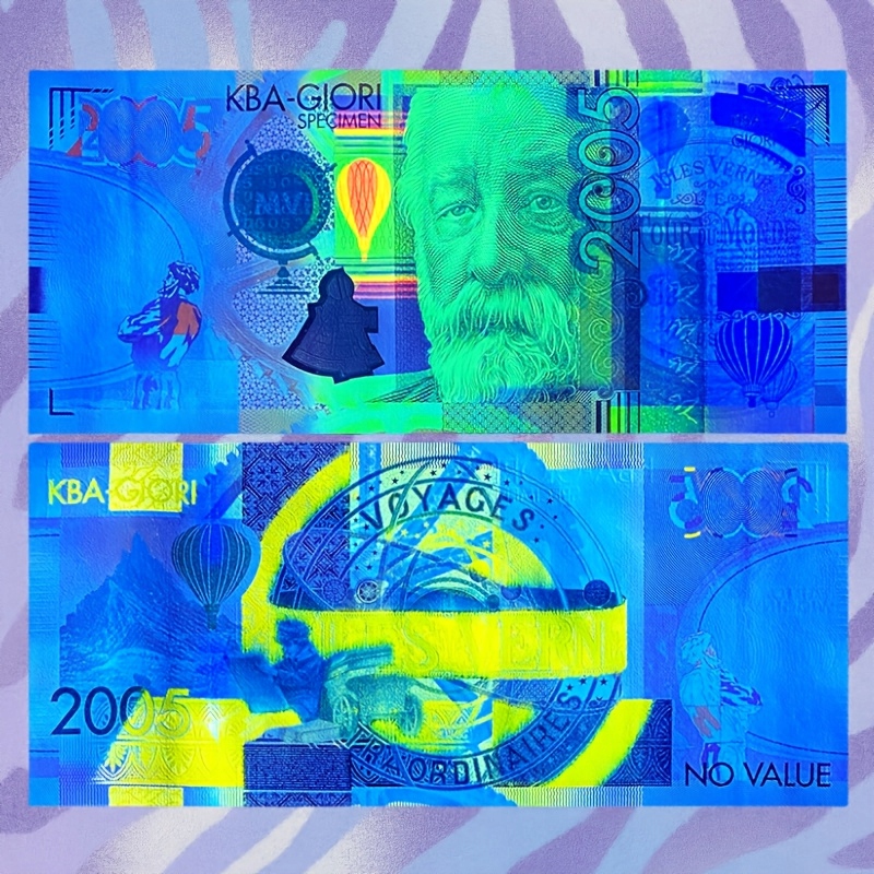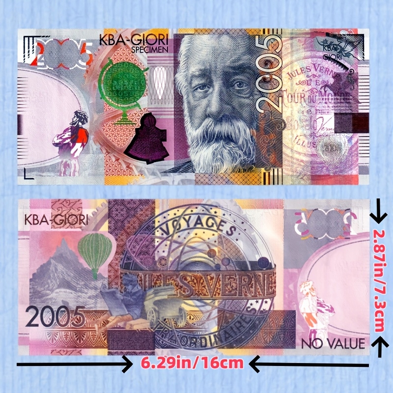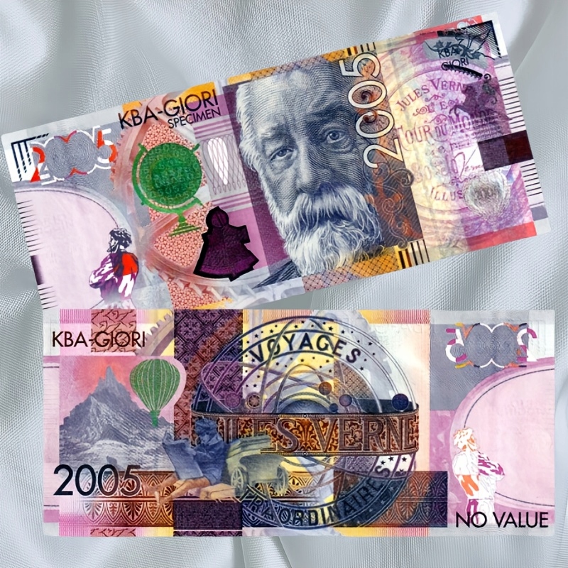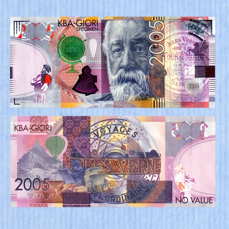 - Rewers: Na rewersie banknotu widać motywy z książek Verne’a, w tym latający balon i tajemniczy pojazd. Dodatkowo umieszczono napis „Voyages Extraordinaires” (Nadzwyczajne podróże) oraz rok wydania 2005.