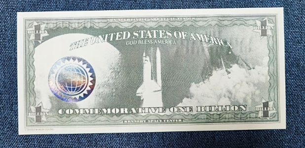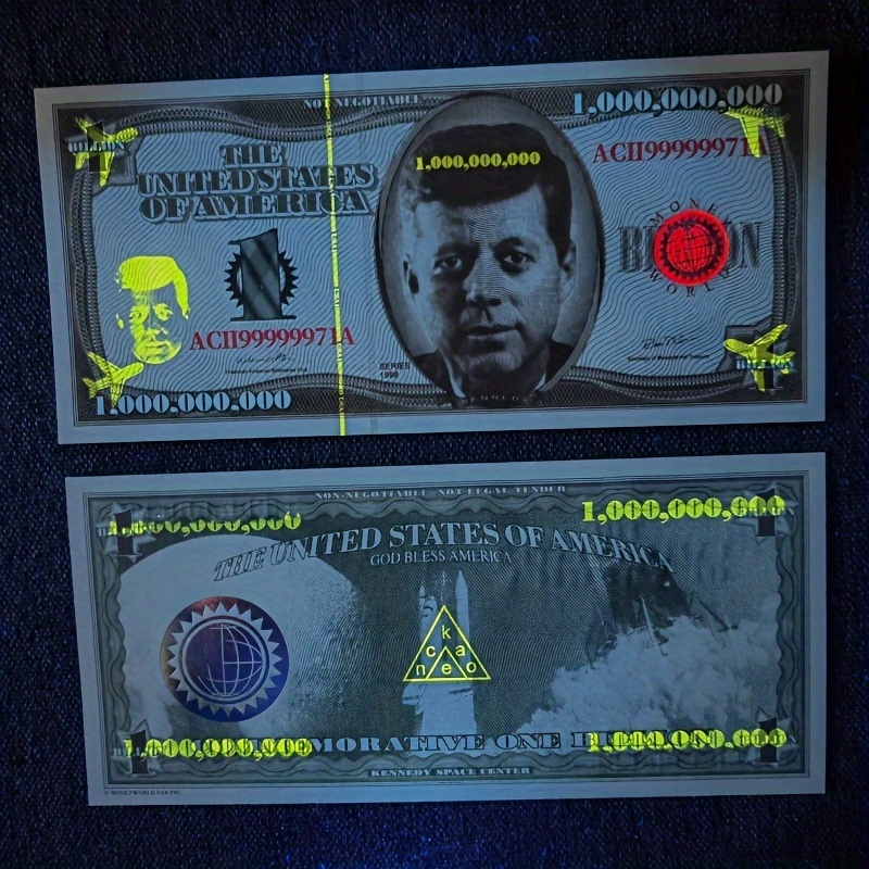 - Tekst: Znajdują się napisy „COMMEMORATIVE ONE BILLION” oraz „KENNEDY SPACE CENTER,” co bezpośrednio łączy banknot z historycznym miejscem nazwanym na jego cześć.