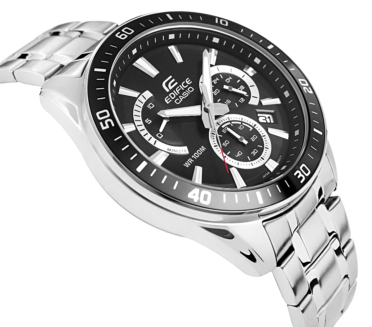 Duży, standardowy chronograf EDIFICE z retrogradą umieszczoną na pozycji godziny 10. Czarny bezel i tarcza wyróżniają się wyrazistym, dynamicznym designem, podkreślając sportowy charakter zegarka. Wyposażony w funkcję daty dni miesiąca oraz chronografy: stoper sekund, minut oraz chronograf 24h. Dzięki wodoszczelności 10 BAR możesz śmiało zabrać go na basen, trening czy wodną przygodę, a fluorescencyjne podświetlenie sprawia, że nawet po zmroku masz pełną kontrolę nad czasem.