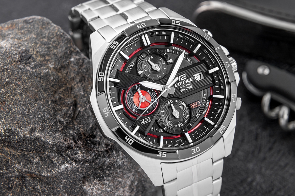 Duży, standardowy chronograf EDIFICE. Jego główną cechą jest dynamiczny design dwuwarstwowej, trójwymiarowej tarczy. Połączenie czerni z czerwonymi metalicznymi detalami na tarczy nadaje zegarkowi elegancki, a jednocześnie sportowy charakter. Wyposażony w funkcję daty dni miesiąca oraz chronografy: stoper sekund, minut oraz chronograf 24h. Dzięki wodoszczelności 10 BAR możesz śmiało zabrać go na basen, trening czy wodną przygodę, a fluorescencyjne podświetlenie sprawia, że nawet po zmroku masz pełną kontrolę nad czasem.