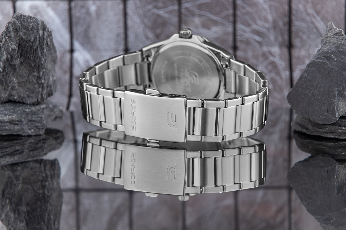 Komfortowa, stalowa bransoleta to znakomite uzupełnienie tego zegarka. Rodzaj bransolety jest gwarancją solidności i wygody podczas codziennego użytkowania. Komfort dopełnia odpowiednia jakość stali, która komfortowo dopasowuje się do męskiego nadgarstka.  Zapięcie sygnowane jest logiem marki Edifice, co podnosi prestiż zegarka i zapewnia wyjątkowość na tle innych marek zegarków.