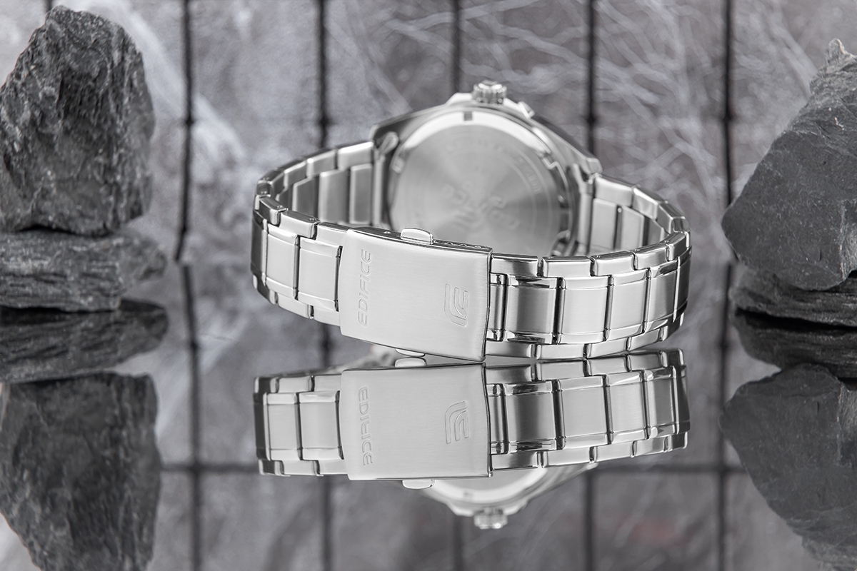 Komfortowa, stalowa bransoleta to znakomite uzupełnienie tego zegarka. Rodzaj bransolety jest gwarancją solidności i wygody podczas codziennego użytkowania. Komfort dopełnia odpowiednia jakość stali, która komfortowo dopasowuje się do męskiego nadgarstka. Zapięcie sygnowane jest logiem marki Edifice, co podnosi prestiż zegarka i zapewnia wyjątkowość na tle innych marek zegarków.