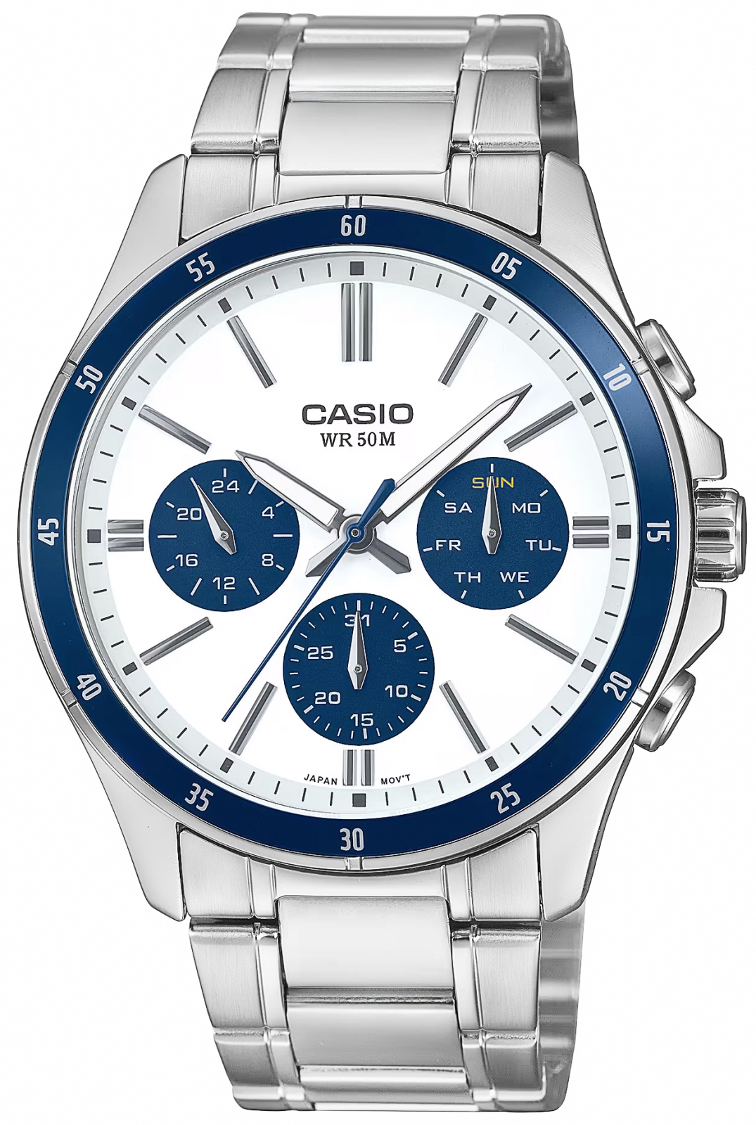 CASIO MTP-1374D-7A2VDF to coś więcej niż zwykły zegarek – to niezawodny partner dla mężczyzny, który chce wyglądać stylowo w każdej sytuacji. Elegancka forma z nutą sportowego charakteru sprawia, że świetnie odnajduje się zarówno przy koszuli, jak i przy codziennym T-shircie. Wyrazisty kontrast tarczy przyciąga wzrok i podkreśla precyzyjne detale, a stalowa koperta i bransoleta z powłoką jonową (ion plated) zapewniają trwałość i odporność na zarysowania. Praktyczne subtarcze – dzień, data i czas 24-godzinny – pozwalają mieć wszystko pod kontrolą jednym rzutem oka. Dokładny mechanizm (±20 sekund/miesiąc) i wodoszczelność do 50 metrów sprawiają, że możesz go nosić bez obaw – w pracy, w podróży, nawet w deszczu. To klasyczny metalowy zegarek analogowy, który nie tylko wygląda dobrze, ale też działa wtedy, gdy go potrzebujesz.