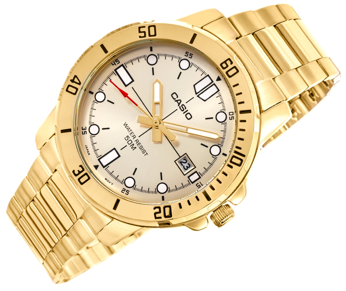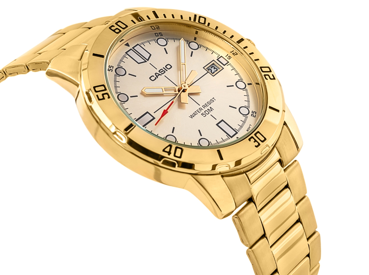 Zdecydowany i elegancki model CASIO przyciągający uwagę już od pierwszego spojrzenia. Koperta o średnicy 44 mm, w całości utrzymana w efektownym odcieniu złota, skrywa jasną, subtelnie połyskującą tarczę z mocnymi indeksami i wyrazistym, czerwonym grotem sekundnika. Solidne wskazówki i kontrastowe oznaczenia godzinowe zapewniają wysoką czytelność w każdych warunkach. Datownik przy godzinie trzeciej pozwala zachować kontrolę nad czasem, a wodoodporność na poziomie 50M daje swobodę ruchu – niezależnie od pogody czy sytuacji. Uzupełnieniem jest złota bransoleta z potrójnym zapięciem – wygodna, trwała i doskonale dopasowana do dynamicznego trybu życia. Precyzyjny mechanizm kwarcowy gwarantuje punktualność, jakiej potrzebujesz na co dzień.