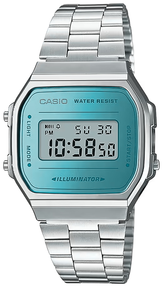 Nie każdy zegarek potrafi połączyć klasykę z charakterem, ale ten robi to bez wysiłku. Casio A168WEM-2EF to powrót do korzeni w najlepszym wydaniu – prosty, czytelny, z lustrzaną tarczą w turkusowym odcieniu, która przyciąga spojrzenia, ale nie robi z tego show. Chromowana koperta i dopasowana stalowa bransoleta tworzą spójną całość – surową, elegancką, bez przesady. Ten zegarek nie potrzebuje trendów. On już dawno wyznaczył własne. Model posiada standardowe wskazanie czasu (cyfrowe): godzina, minuta, sekunda, oznaczenie pory dnia (PM), data, dzień tygodnia. A gdy przychodzi moment działania – ma wszystko, czego trzeba. Stoper 1/100 sekundy, funkcja międzyczasów, codzienny alarm i sygnał godzinowy – praktyczne narzędzia w zgrabnym wydaniu. Wieczorem, gdy światło przygasa, wystarczy jedno naciśnięcie – elektroluminescencyjne podświetlenie w odcieniu niebieskozielonym rozjaśni tarczę i nada jej niepowtarzalnego klimatu. Model posiada również odporność na zachlapania – bo życie nie pyta, czy masz parasol.