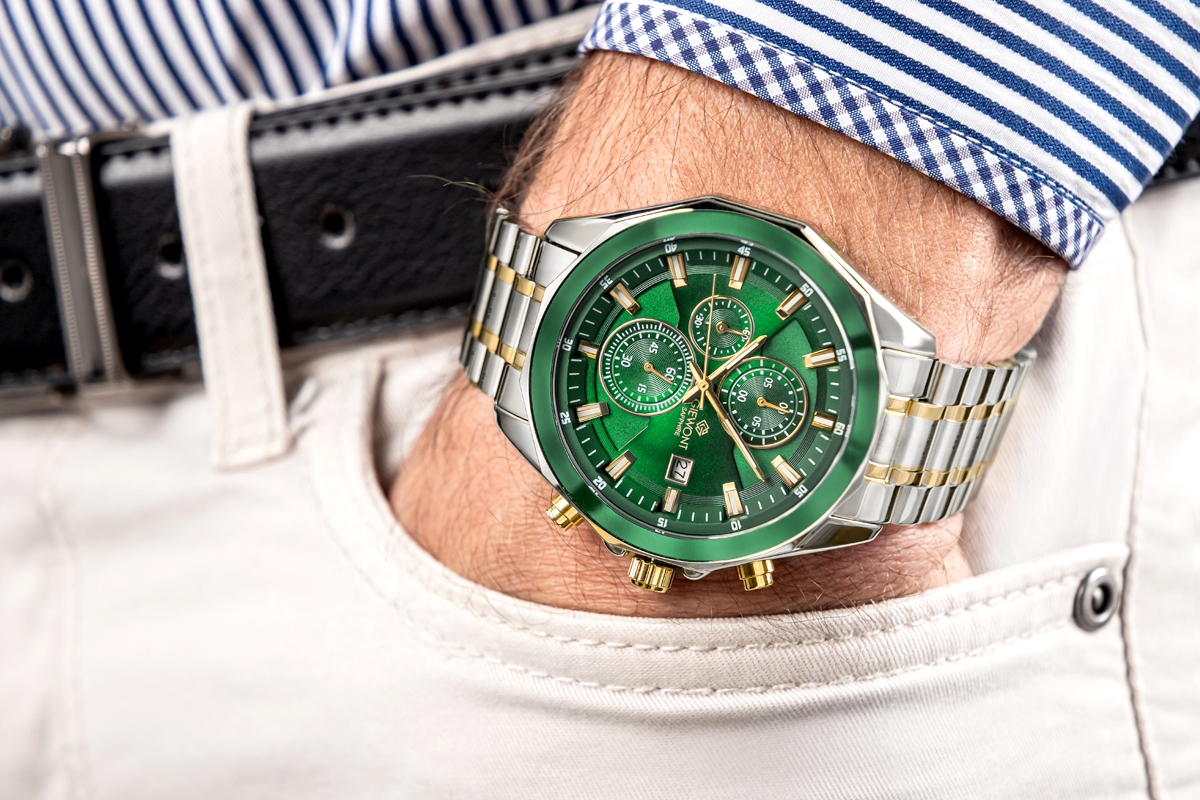 Chronografy w tym modelu pozwalają na śledzenie czasu z niesamowitą dokładnością. Stoper odmierza czas co do sekundy, co sprawia, że ten zegarek jest idealnym towarzyszem zarówno podczas treningów, jak i w codziennym życiu, gdy liczy się precyzja. Możesz uruchomić stoper jednym przyciskiem i dokładnie kontrolować czas swoich działań – idealne dla mężczyzny, który ceni punktualność i perfekcję w każdym aspekcie. Możesz również mierzyć czas w różnych jednostkach, np. minut i sekund, co daje pełną kontrolę nad dłuższymi okresami czasu. Dodatkowo dzięki fluorescencyjnym wskazówkom możesz sprawdzić godzinę w każdej sytuacji – wystarczy jedno spojrzenie, by odczytać godzinę, czy jesteś w słabo oświetlonym pomieszczeniu, czy na nocnej eskapadzie. Ten model posiada również funkcję daty dni miesiąca.