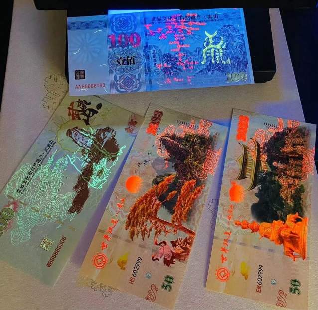 Napisy: „World Cultural and Natural Heritage Mount Tai”, „Taihang Mountains”.